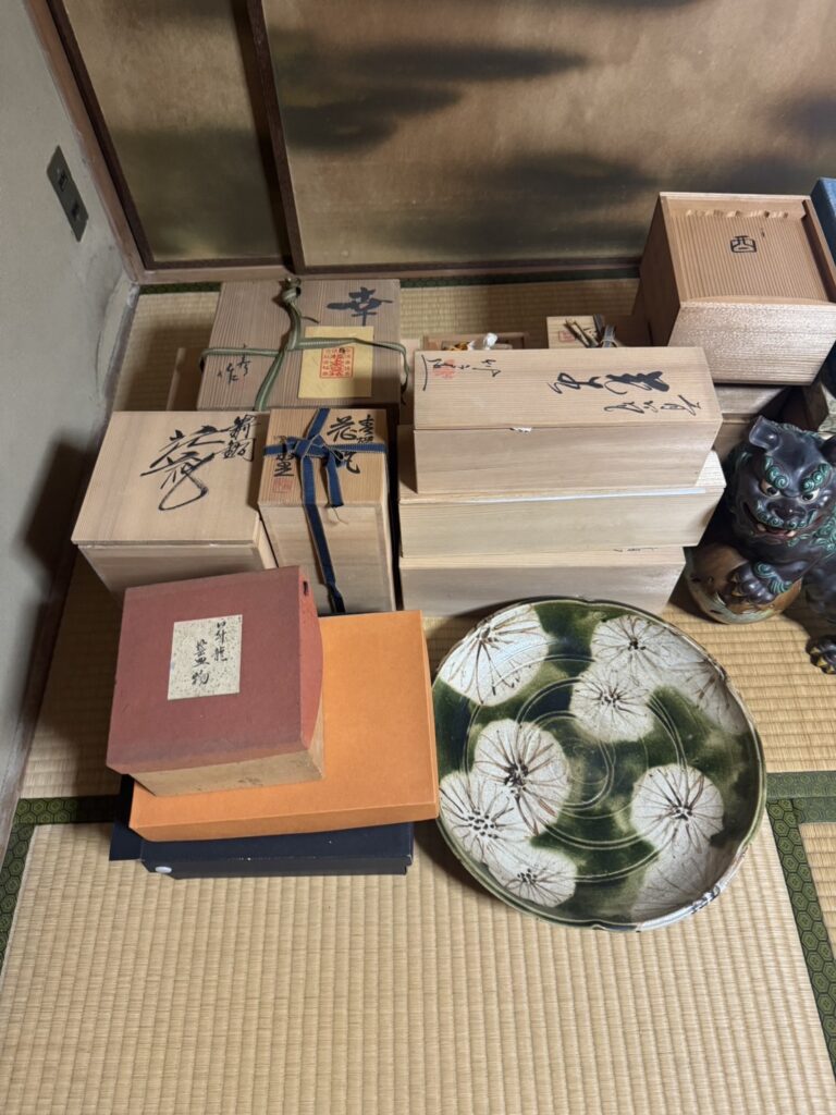 畳の間には、現代作家による陶器や茶道具類も点在しており、箱書きや印のある作品も複数。作家系陶芸や昭和の民芸品まで幅広く、コレクターの息遣いを感じました。