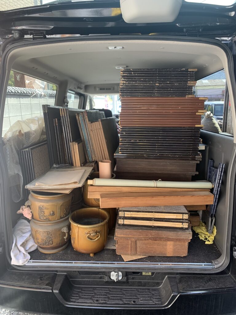 車の荷台がご覧の通り、ギッシリ満載。屏風や掛軸を中心に、表具済の額装、硯箱や木箱に入った書画道具、そしてどっしりとした銅火鉢まで……。