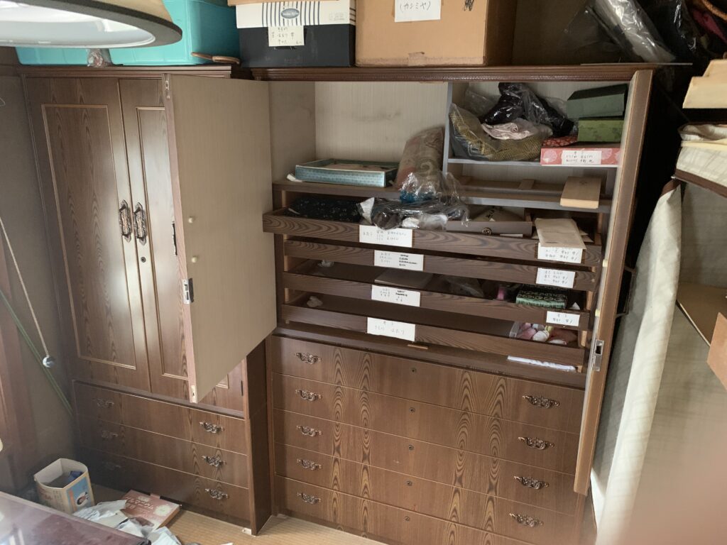 まずはお部屋の中をチェック。畳の上には、仕立て前の反物や帯、書道道具に硯箱、未使用のギフト箱があちこちに。タンスの中には、丁寧に分類された和装小物や、保存状態の良い着物が何枚も眠っていました。